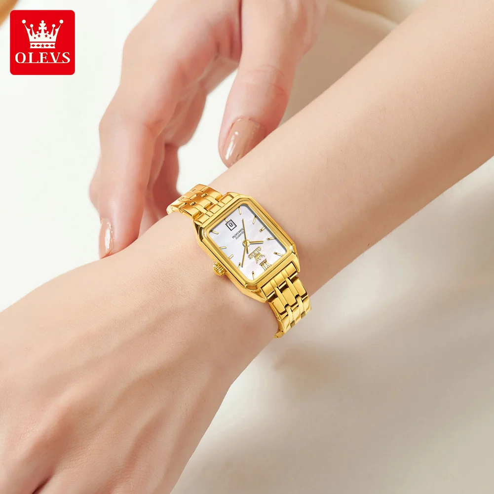 ساعة كوارتز جديدة OLEVS 5616 للنساء، ساعة ذهبية مربعة أنيقة، تقويم مقاوم للماء من الفولاذ المقاوم للصدأ للسيدات